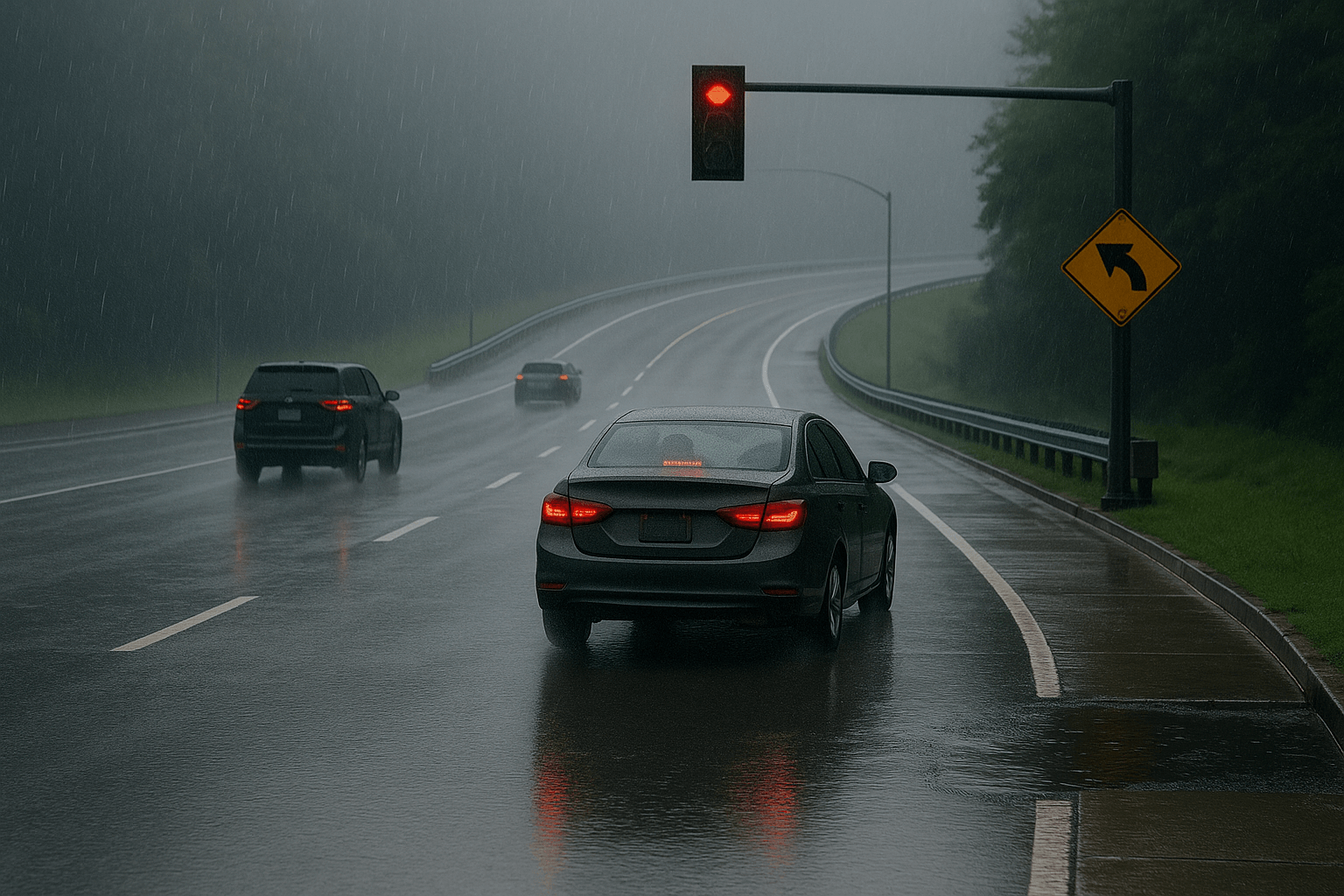 - 곡선 구간: 젖은 도로에서 급조향은 차량 중심을 쉽게 잃게 합니다.