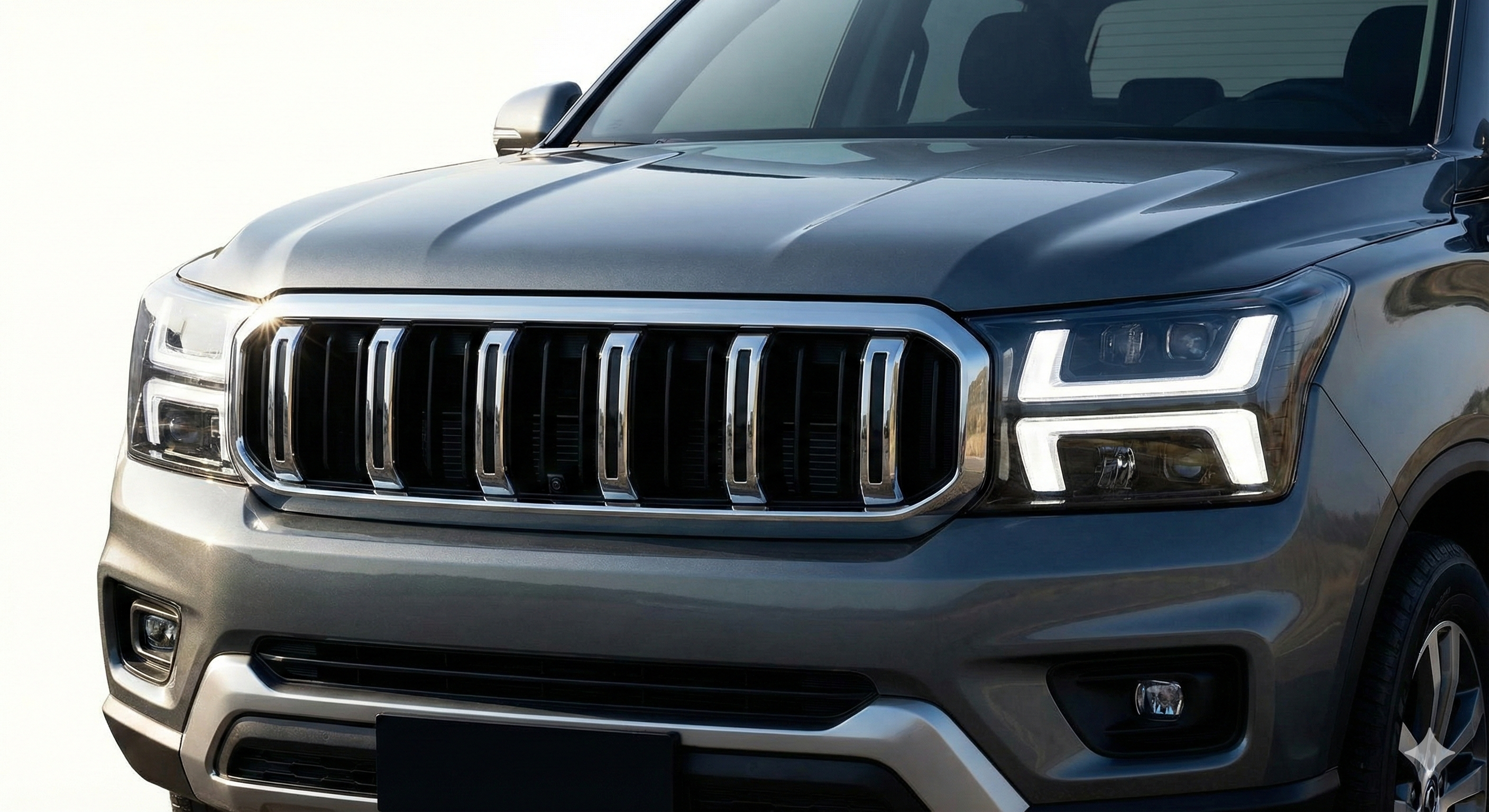 중앙에 배치된 5슬롯 그릴은 정통 오프로더의 강인함을 강조하며, 웅장하고 견고한 인상을 심어줍니다.